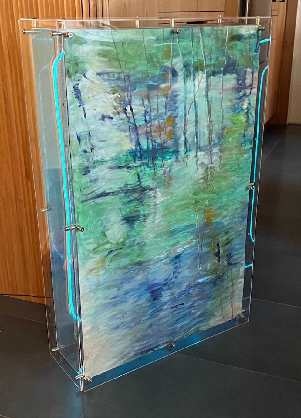 Reflecting Pool II, oil on canvas with plexiglass and LED lights, 12x36x60”